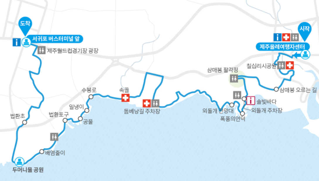 Olle Course 7 starts at the Jeju Olle Trail Traveler Center in Seogwipo and runs about 17.7 km to Awaenangmok (아왜낭목) in Wolpyeong Village. It is often called the highlight of the entire Jeju Olle trail system, and for good reason.