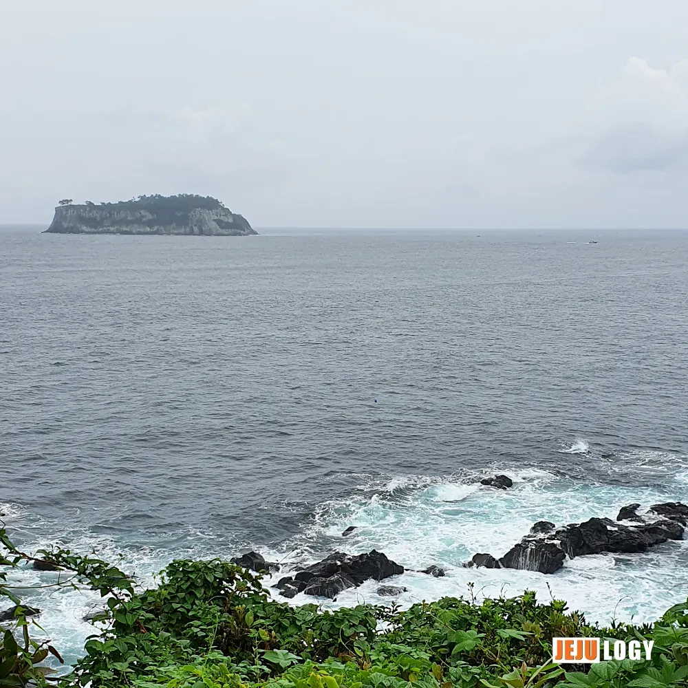 Beomseom Island (범섬) spread out in front of me, looking different from every angle. The sky and water were dull under the rain, which was a shame, but up close, the sheer scale of Beomseom's columnar joints is something else. The cliffs beneath the trail are full of columnar joints too, and Beomseom across the water makes them look even more impressive. Moments like these remind you, viscerally, that all of Jeju is a volcanic island.