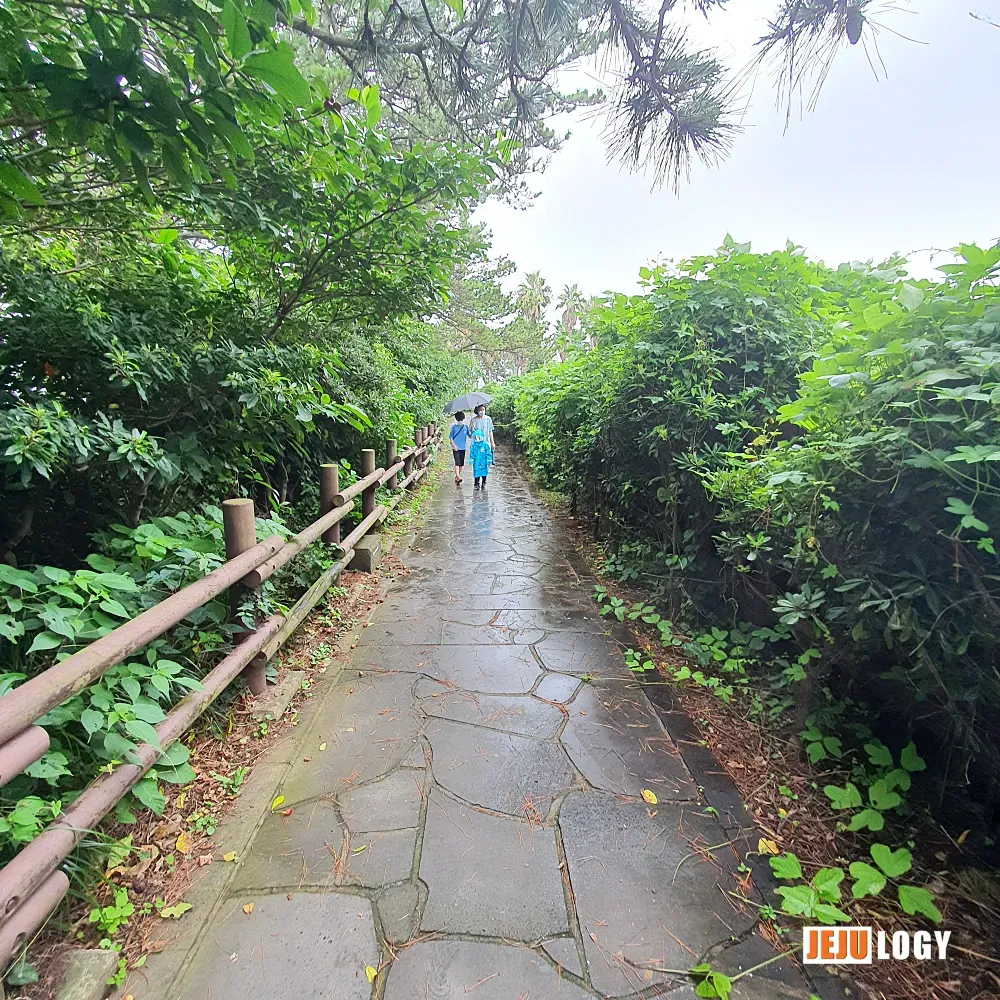Olle Course 7 is often called the highlight of the Jeju Olle trail system. On a rainy day, I walked a short stretch near Dombenang-gol — past columnar joints, subtropical ravines, and views of Beomseom Island. You don't need the full 17.7 km to feel what makes this trail special.