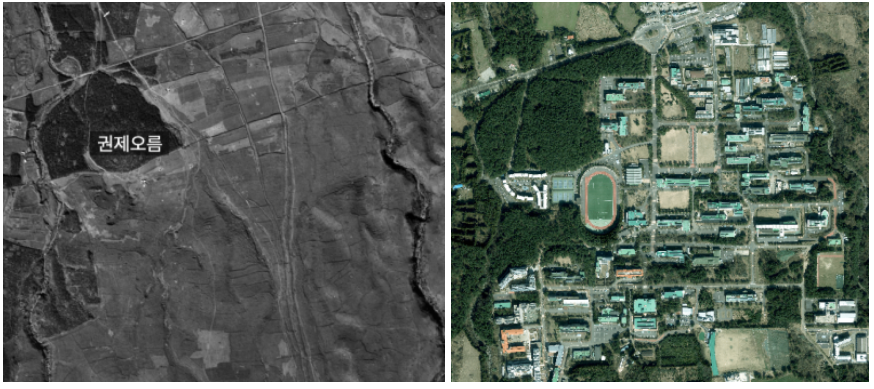 Looking at the photos, the contrast is striking. On one side, you see the oreum standing completely alone before the university moved here in 1980. On the other, you see the modern campus buildings practically hugging the base of the hill. It’s a rare sight to see how the school grew around the volcano without tearing it down.