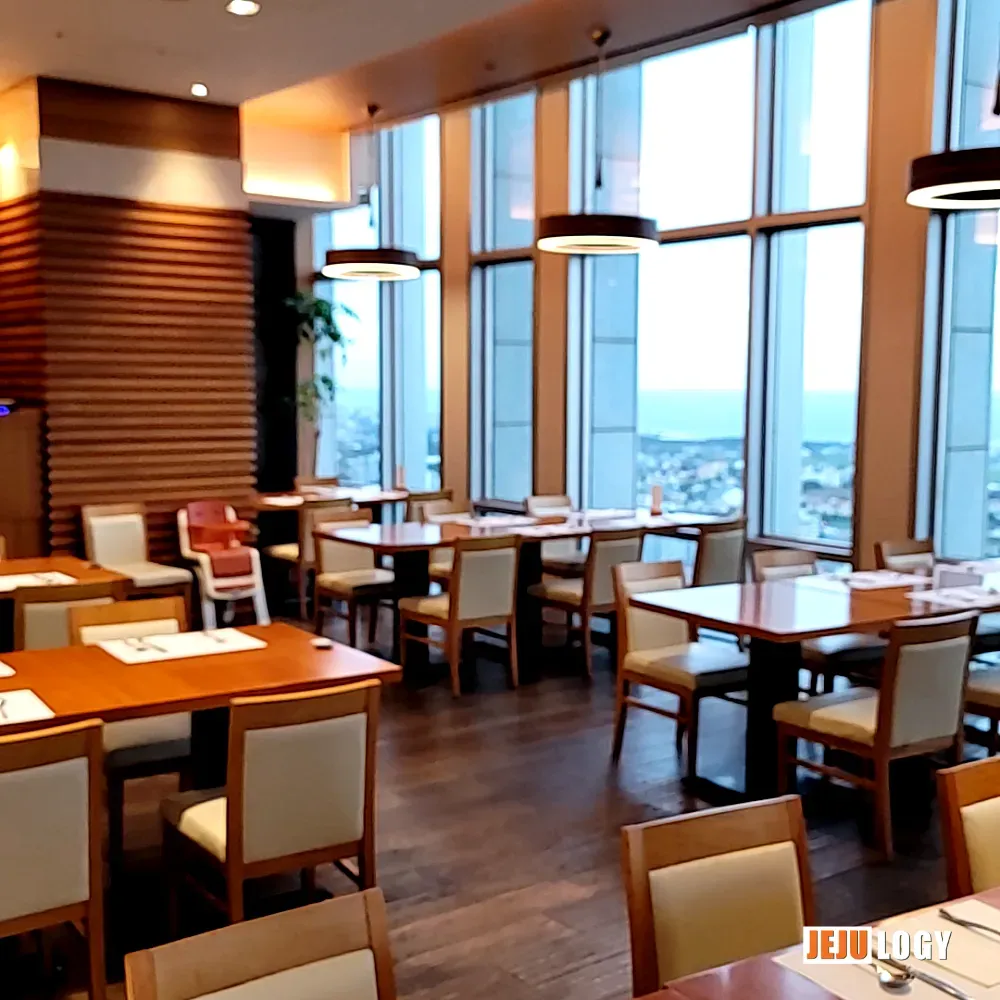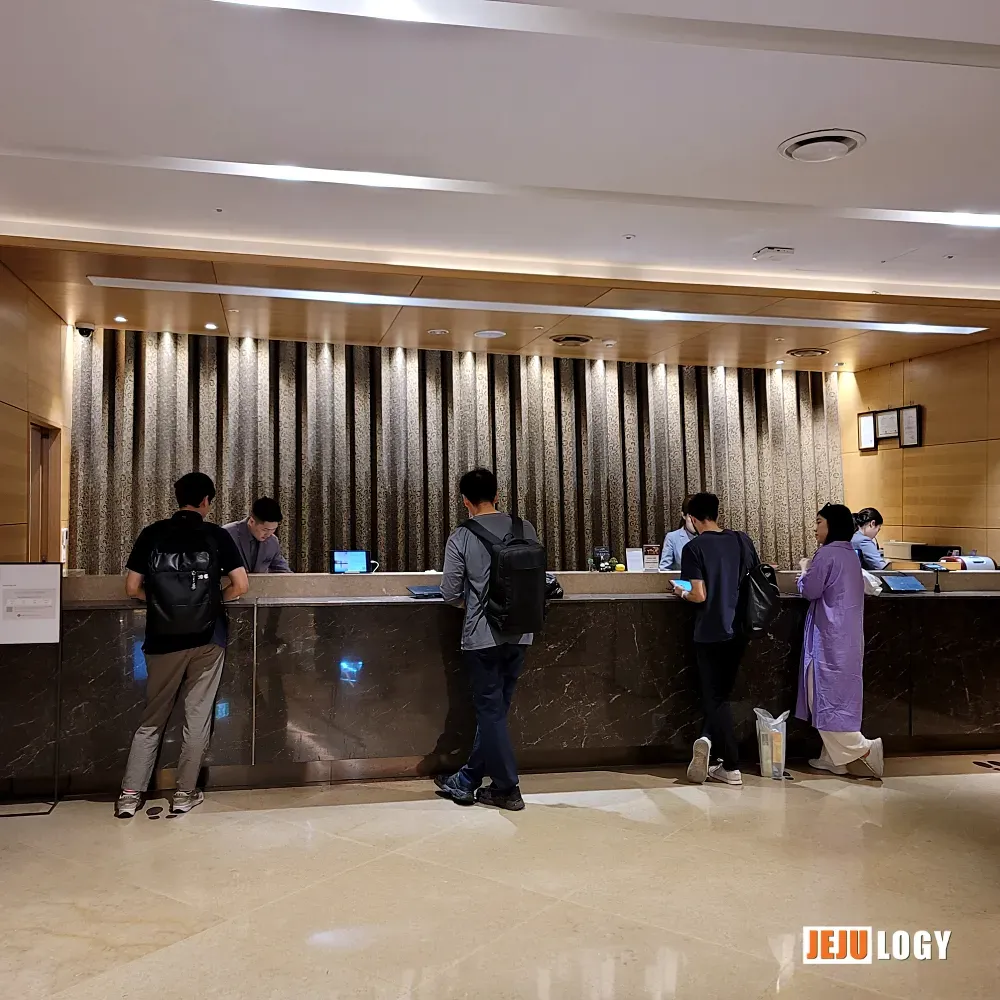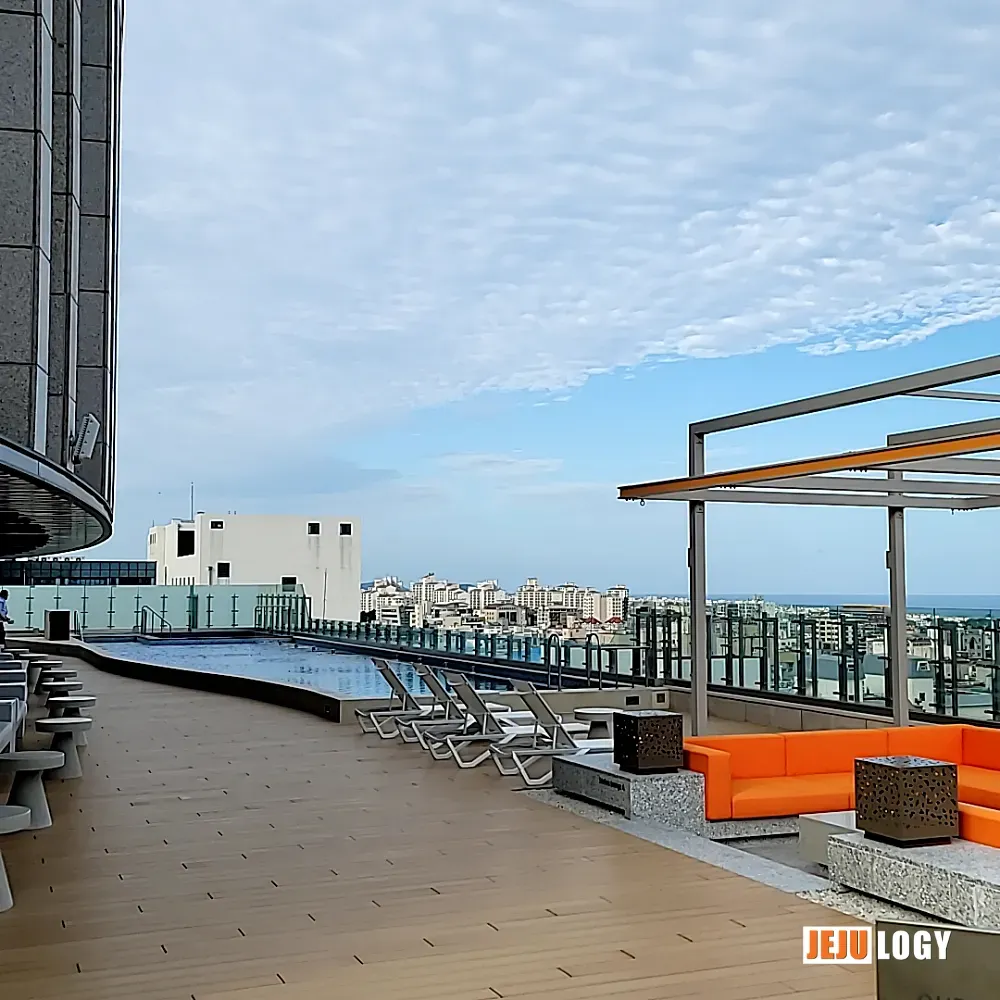 Despite the business hotel positioning, the property offers a solid range of amenities on floors 7 and below: a fitness center, outdoor swimming pool, laundry room, and conference rooms. Guest rooms extend up to the 21st floor — quite tall by Jeju standards.