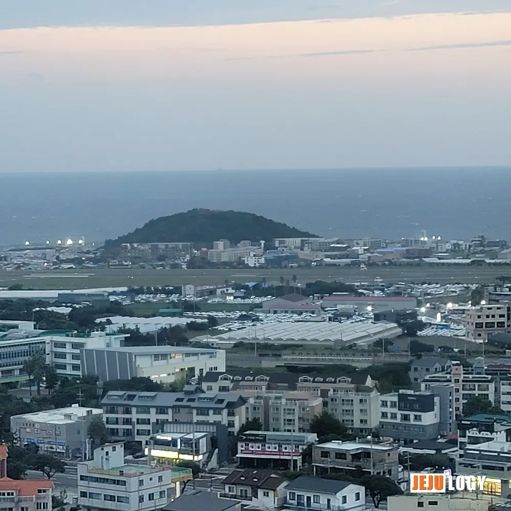 The city-center location means the daytime view from the room is nothing special. But come morning, Jeju International Airport fills the window — the control tower and early aircraft already busy at work. Dodoubong (도두봉) is also visible on the horizon, a quietly pleasant surprise.