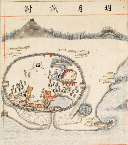 It depicts an archery scene at Myeongwoljin. An interesting detail in the inscription: on the 14th day of the 11th month in the year Imo (1702), the 17 archery instructors (gyosajang, 교사장) on the right side of the field lost by 141 points.