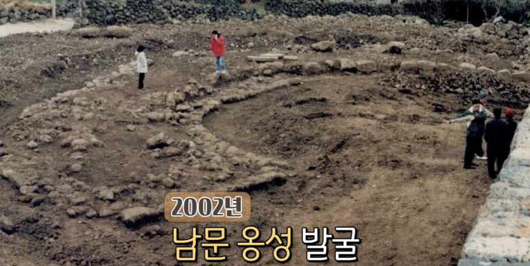 As mentioned above, a 2001 excavation of the south gate area uncovered the foundation stones of the gate tower (munru, 門樓) and part of the ongseong barbican. The following year, during restoration work in 2002, a farmhouse that had been built over the ongseong site in front of the south gate was demolished, and the original base stones of the barbican were excavated intact.