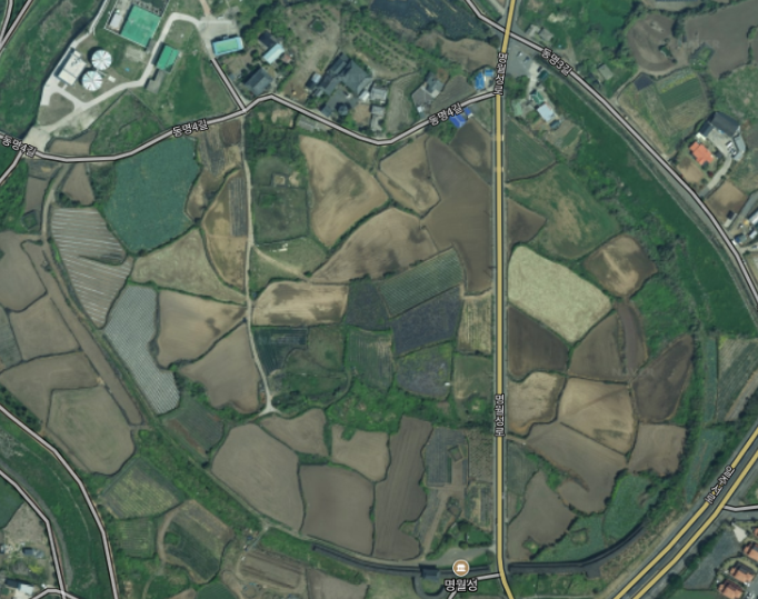 Seen from above, Myeongwoljinseong has a roughly oval footprint, slightly elongated along a northwest-to-southeast axis. Even on foot, if you follow the curving line of old wall stones running between village houses and fields, you can trace out the general circumference. The perimeter measures roughly 1.3 to 1.5 km, with walls standing about 4 meters high.