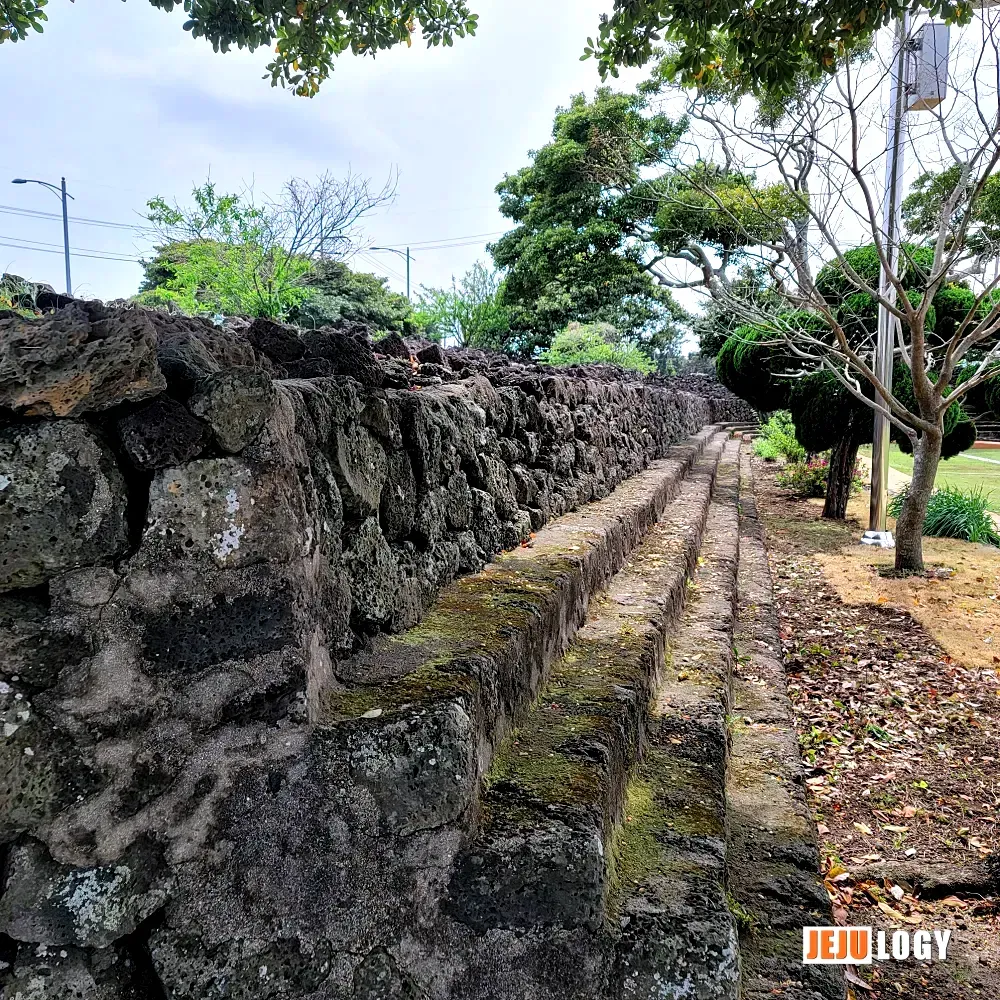This is not the only case of a Jeju garrison wall finding a second life. The grounds of Hwabuk Youth Cultural Center were once Hwabuk Jinseong, whose walls partially framed a schoolyard until Hwabuk Elementary School relocated in 1971. Similarly, at Aewol Jinseong on the island's northwest coast, sections of the original fortress wall still stand as the boundary fence of Aewol Elementary School.